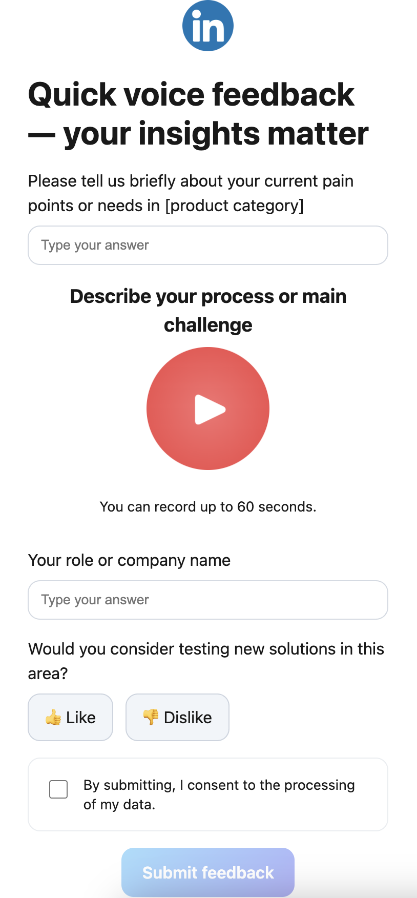 To collect voice-based insights from Ideal Customer Profiles (ICP) after initial contact on LinkedIn or email outreach.