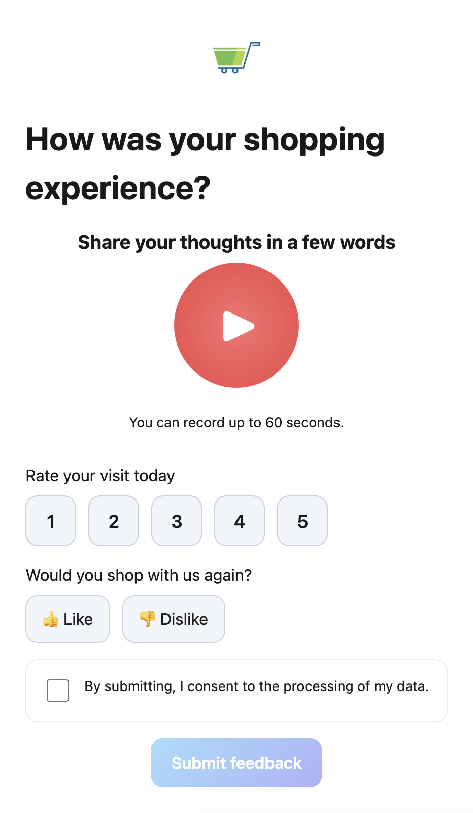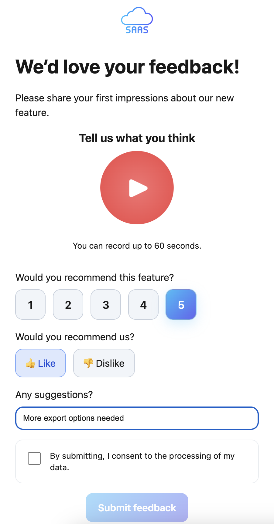 • Audio input (core), static title/text/image, text input, checkbox, CSAT scale (1–5), like/dislike toggle, and more. You can style the form (colors, fonts, border radius) and customize the post-submit screen (title, text, CTA button).